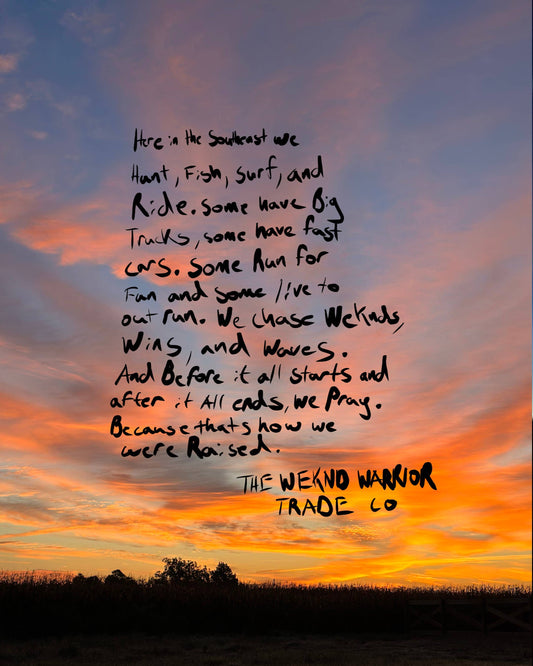 "The Weknd Warrior Trade Co. (pronounced “Weekend”) Founded in November 2016 in the small town of Laurinburg, NC, The Weknd Warrior Trade Co. was brought to life by brothers Harley and John Locklear, alongside Harley’s wife, Arianna. What started as a vision for a local outfitter has evolved into something far greater—a lifestyle and a brand that resonates with dreamers, doers, and weekend warriors alike.
