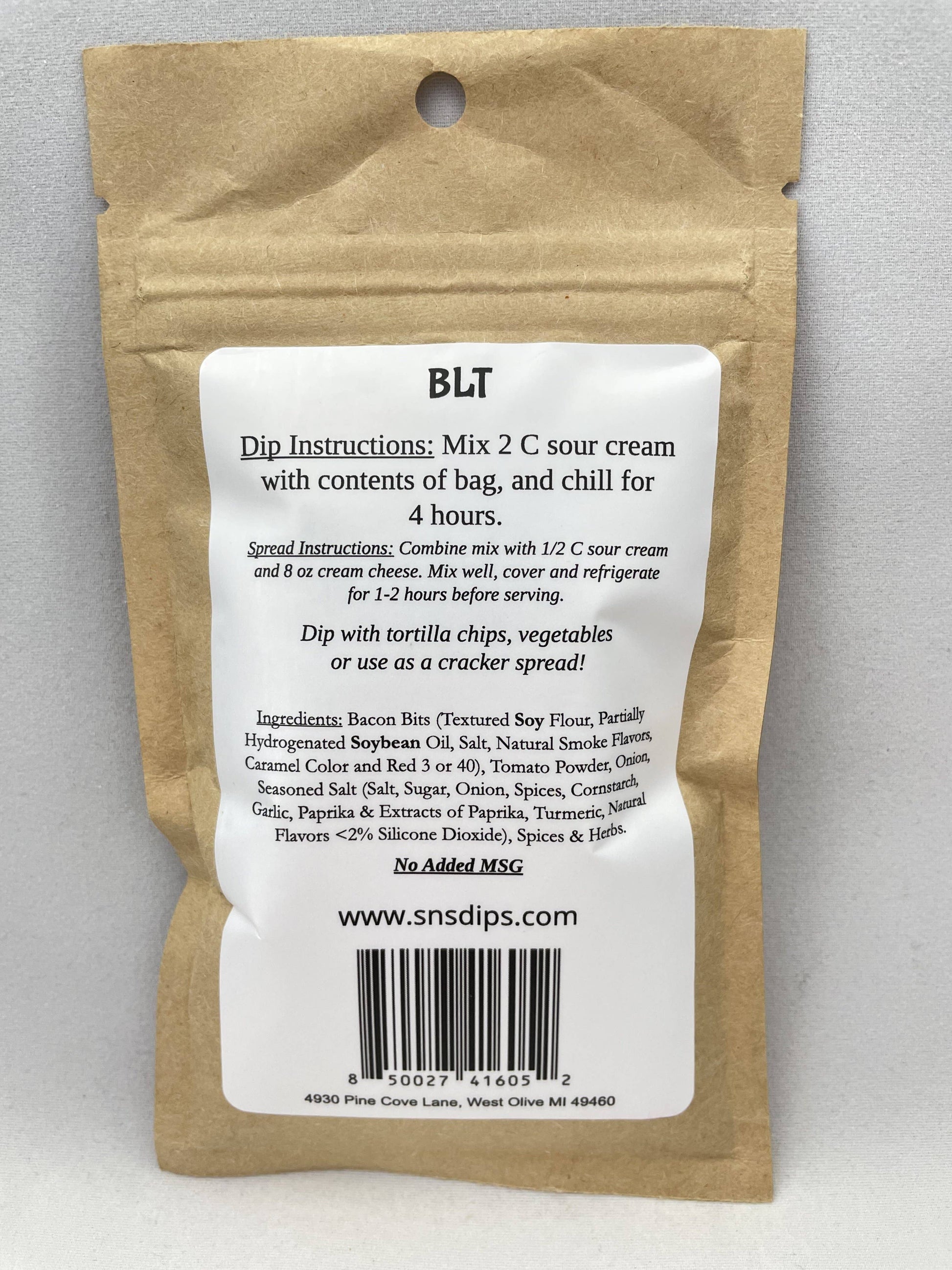 BLT Dip tastes just as good as it sounds! Wonderful tomato and bacon flavoring, and is simple and easy to make. Just add Sour Cream or yogurt. Stir until well blended. Cover and refrigerate for at least 2-4 hours before serving. Serve with Chips, Crackers or Vegetables. GLUTEN FREE